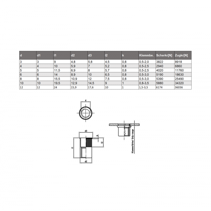 | d | d1 | I1 | d2 | d3 | I2 | k | Klemmbe. | Scherkr[N] | Zugkr[N] |