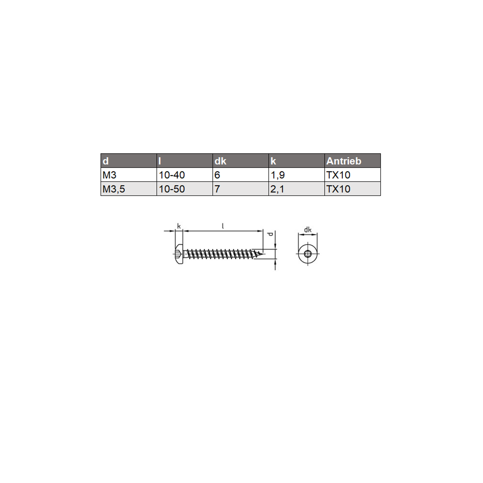 | Durchmesser | 3×10 mm, 3×12 mm, 3×16 mm, 3×20 mm, 3×25 mm, 3×30 mm, 3×35 mm, 3×40 mm, 3,5×10 mm, 3,5×12 mm, 3,5×16 mm, 3,5×20 mm, 3,5×25 mm, 3,5×30 mm, 3,5×35 mm, 3,5×40 mm, 3,5×45 mm, 3,5×50 mm |